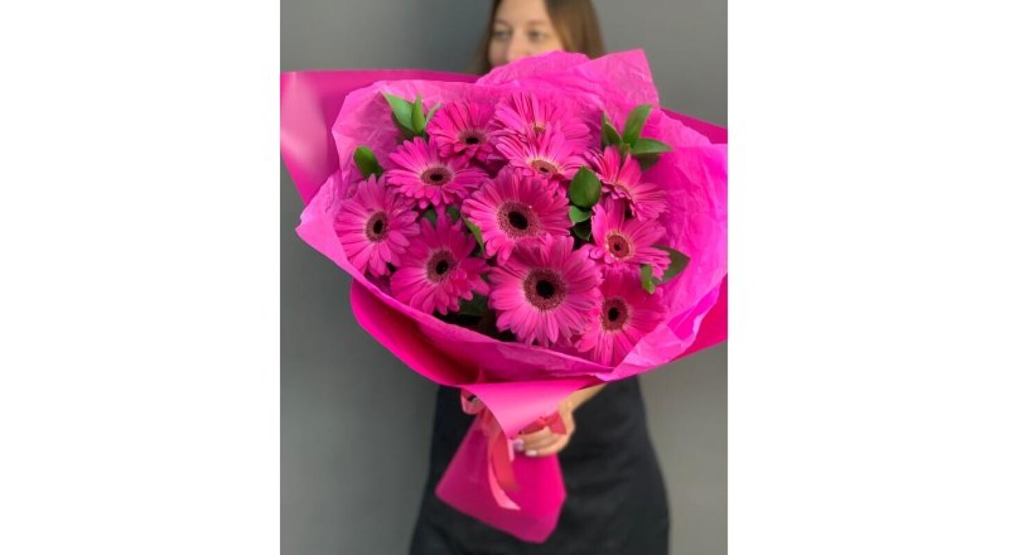 Шикарный выразительный букет из гербер с зеленью, в яркой упаковке