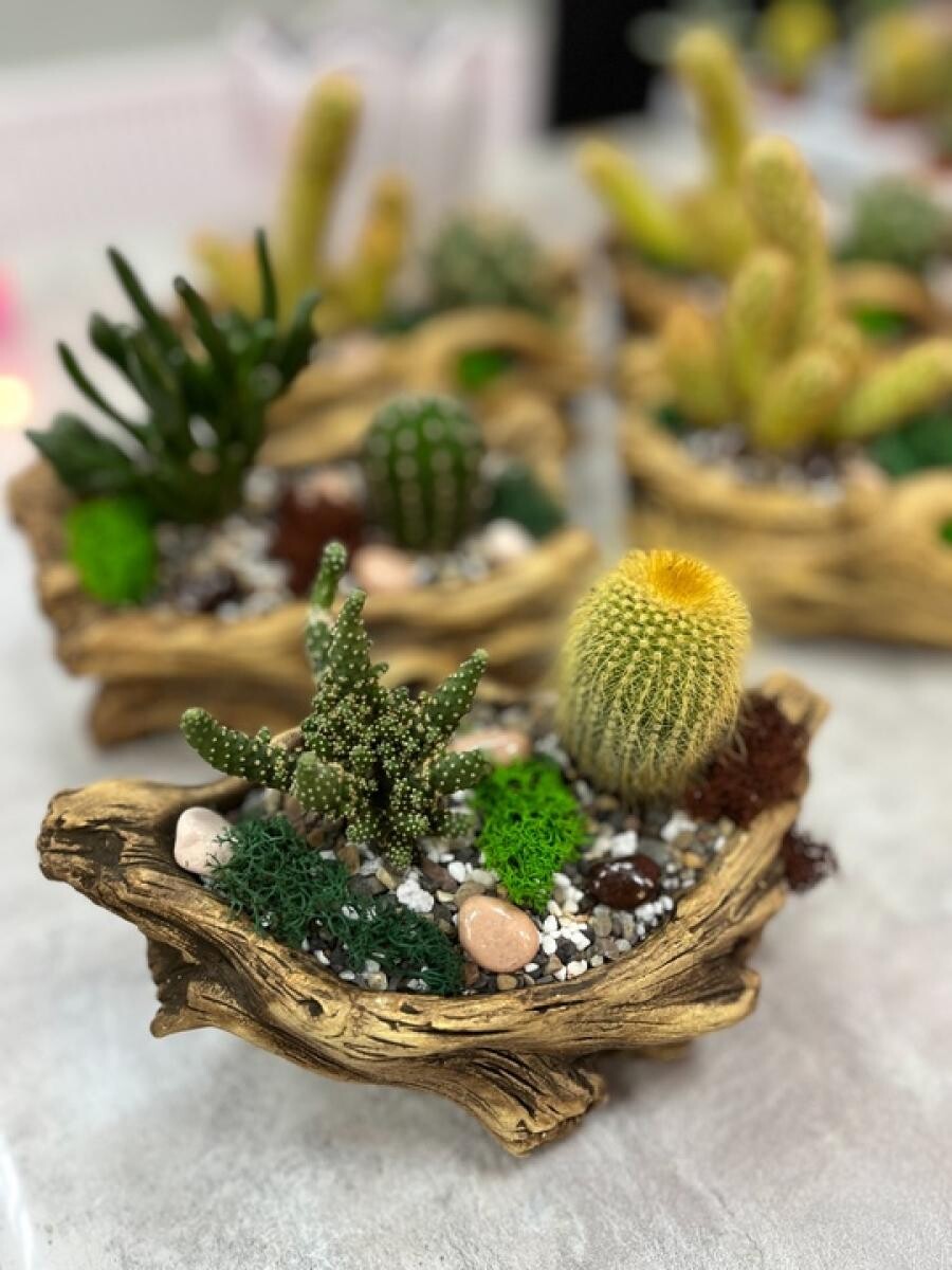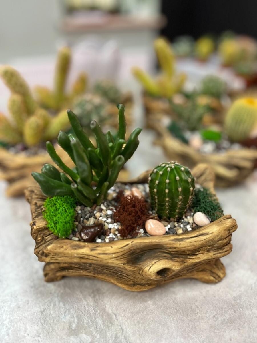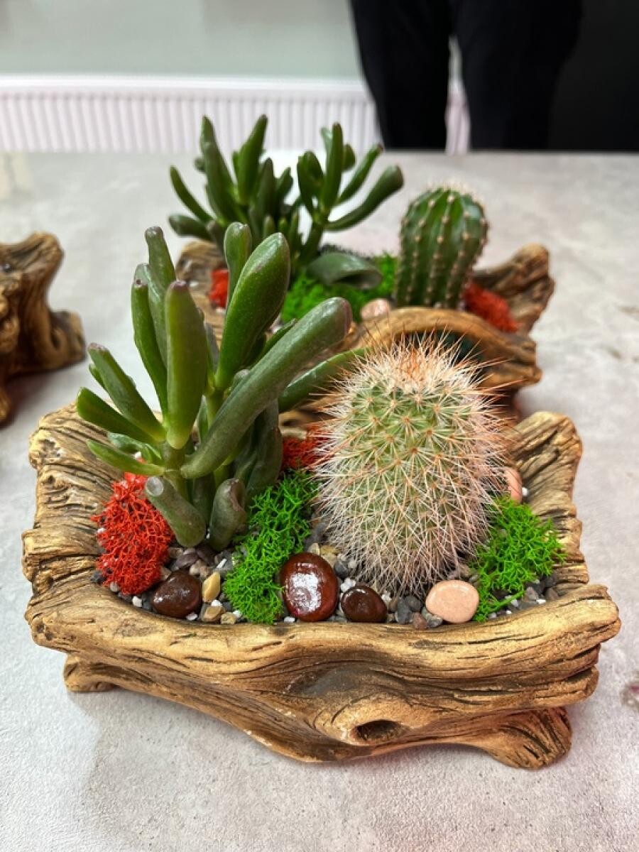 Комнатные растения (кактусы, суккуленты) в керамическом кашпо.